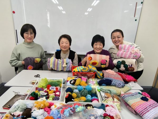 この活動は全国に広がり、名称も団体ごとに異なりますが、天王寺区オレンジキャラバンの会では使う人も作る人もほっこりなごめるようにとの意味を込めて『なごみマフ』と名付け、認知症カフェを拠点にボランティア活動を行っています。完成した作品は百貨店などで展示譲渡会を行い、希望者に無償提供しています。